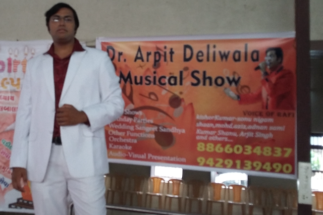 Dr Arpit is a MBBS Doctor by Profession as well as Multi-Talented Artist who can perform in voice of more than 21 Bollywood singers ranging from Mohd Rafi,Kishore Kumar,Mahendra Kapoor,Shailendra Singh,Mohd Aziz,Shabbir Kumar,Suresh Wadkar,Udit Narayan,Kumar Sanu,Sonu Nigam,Shaan,KK,Shanker Mahadevan,Lucky Ali,Adnan Sami,SP Balasubranium to Present singers like Atif Aslam,Arijit singh,Mohit Chauhan,Ankit Trivedi and more.. Dr Arpit has done more than 200 Shows in different cities of India like Mumbai, Delhi, Ahmedabad, Rajkot, Kashmir, Indore,Ujjain,Mount Abu,Jaipur and more. Dr Arpit Deliwala with his expert Computer Team under leadership of Dr Dilip Deliwala and Vijeet Deliwala(B.E.Comp Engi.) has developed more than 1000 Audio Visual Songs of Bollywood and entertained and mesmerized the Audience with unbelievable Audio-Visual Enchanting effects of the songs with unique Presentation during Live and Online Shows.